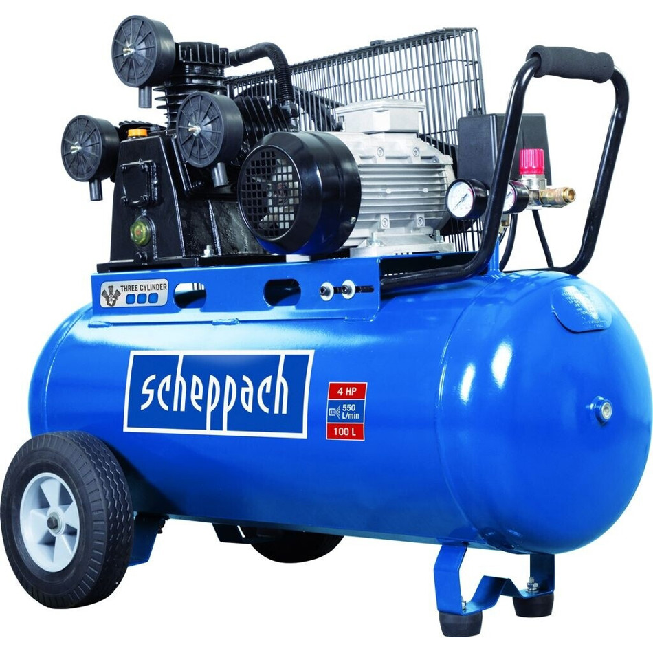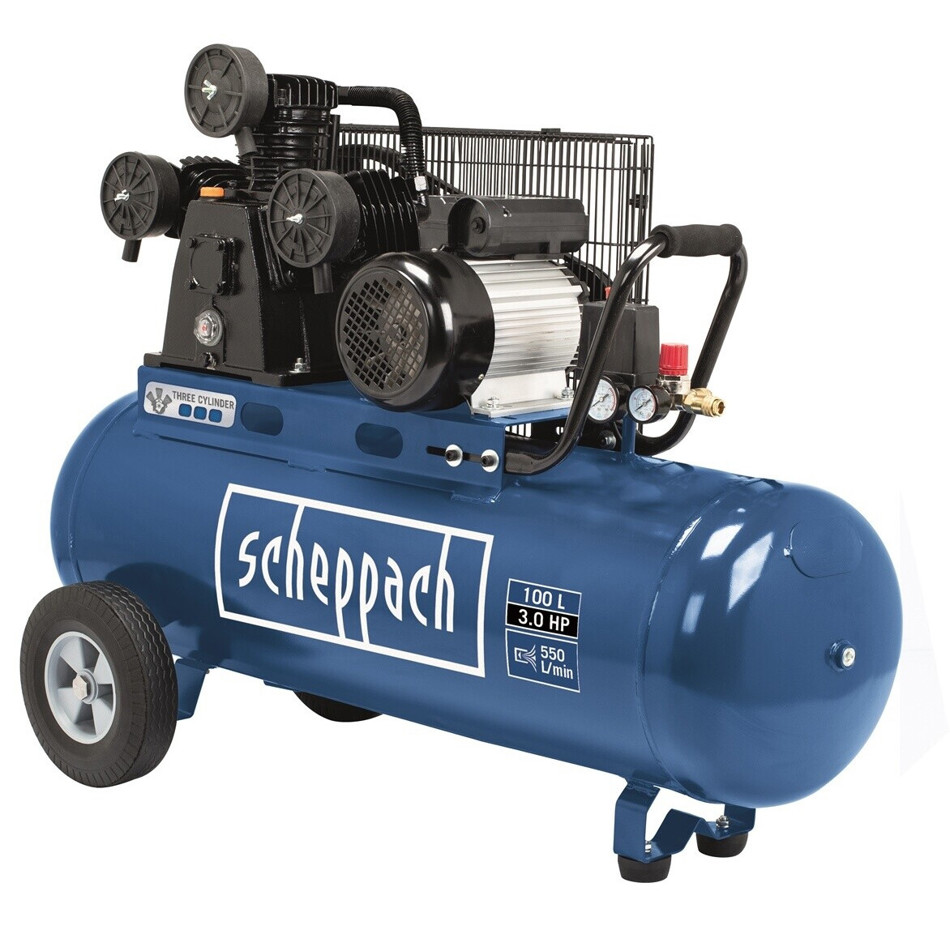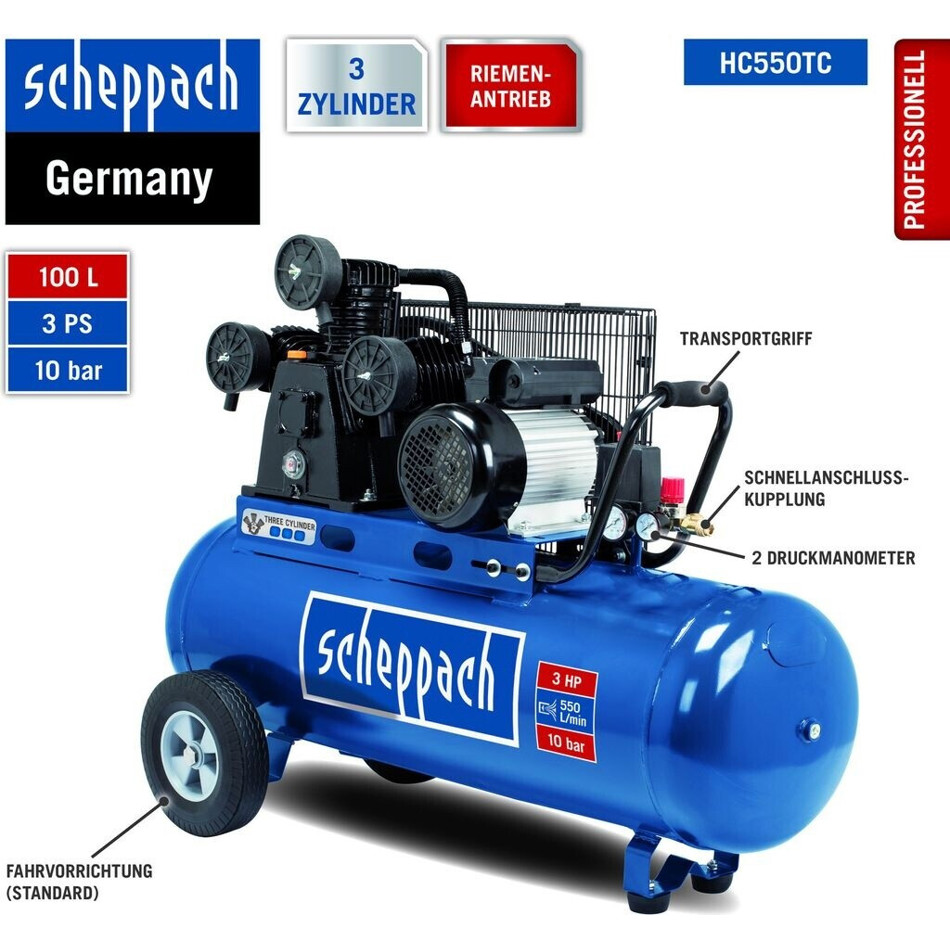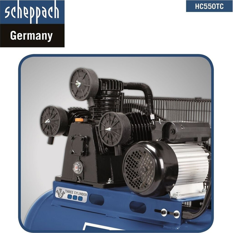 Der Scheppach HC550TC bietet eine Leistung von 2,2 kW, einen maximalen Druck von 10 bar, eine Ansaugleistung von 550 l/min und verfügt über drei Zylinder für eine effiziente Performance.
